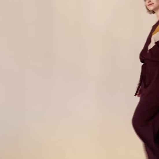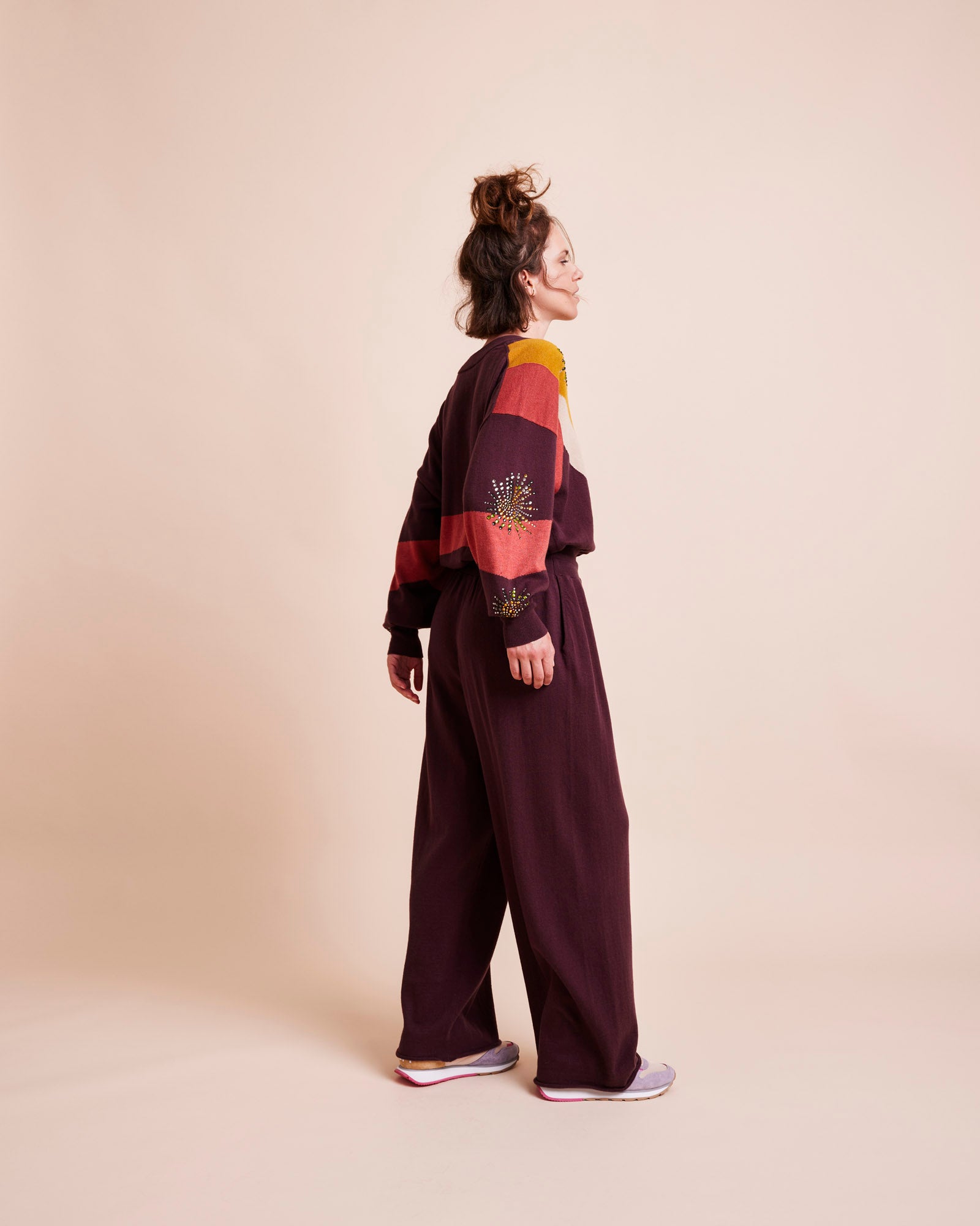 A jumpsuit that feels like loungewear but looks like you’re about to be papped après-ski in 1987? This one’s got it all: soft, muted berry tones. A pop of mustard. A batwing sleeve that brings the drape. And a front panel that’s giving vintage ski suit energy (but way chicer). The crystal starburst on the front and sleeve give just the right amount of sparkle.
